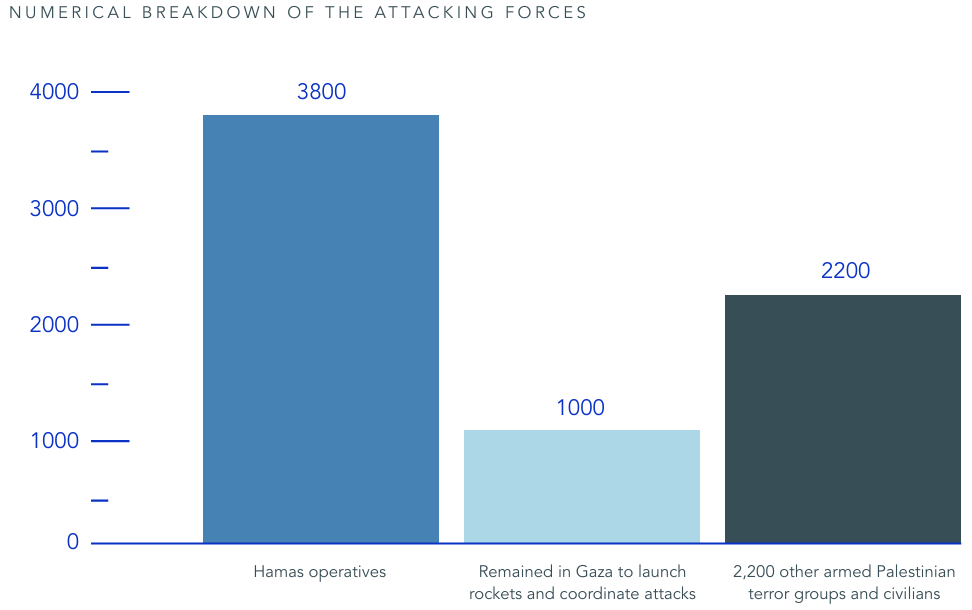 - Hamas orchestrated and led the attack, with 3,800 of its elite Nukhba forces and members of Izz al-Din Al-Qassam Brigades invading Southern Israel. They were supported by 2,200 individuals from other armed groups, including Palestinian Islamic Jihad, and civilians from Gaza. A further 1,000 individuals stayed in Gaza to operate rocket launchers and provide tactical support