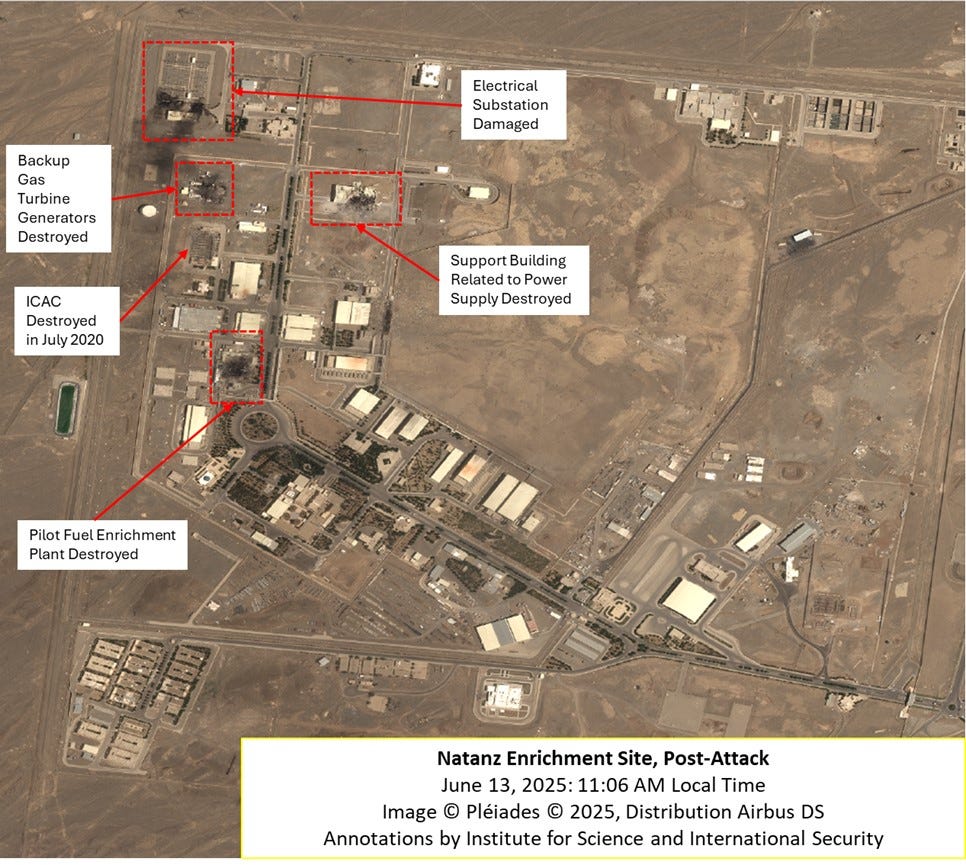 Source: The Institute for Science and International Security - A senior Israeli official told Israeli media that Israel dealt a “severe blow” to Natanz but did not destroy it, and “there will be more strikes.”